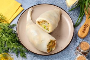 Получившейся смесью плотно нафаршируйте тушки кальмаров. Если начинки слишком много, срезы можно скрепить деревянными зубочистками, чтобы начинка не вывалилась в процессе жарки.