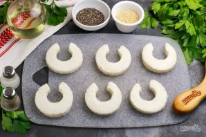 Таким образом сформируйте и остальные подковки из хлеба, используя подручные гаджеты. Обмажьте их сверху и по бокам плавленым сыром.