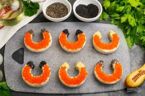 Идеально к столу и к напиткам. Яркие канапе с красной икрой обязательно привлекут внимание всех гостей. Создайте их в виде подковок, чтобы задобрить символ наступающего Нового года — Лошадь! Создавайте закуску вместе с детьми, они обожают такие уникальные блюда. По желанию вырезанные мякиши можно поджать на растительным масле, если вы любите более хрустящие основы