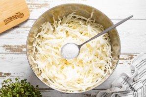 Белокочанную капусту тонко нашинкуйте. Добавьте соль. Перемешайте, немного пожмите руками, чтобы капуста осела и пустила сок.