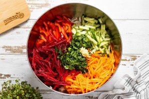 Морковь и свеклу очистите от кожуры, натрите на терке. Я использую терку для моркови по-корейски. Огурец и болгарский перец порежьте соломкой. Петрушку мелко порубите, чеснок пропустите через пресс.