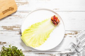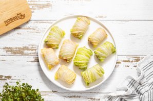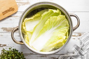 Затем подготовьте пекинскую капусту. Разделите ее на отдельные листы, опустите в кипящую воду на 5 минут, чтобы она стала мягкой. Слейте воду, а капустные листы остудите.
