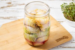 Влейте получившийся рассол в банку, так, чтобы он полностью покрыл рулетики. Если они будут всплывать, то сверху прижмите каким-нибудь грузом.