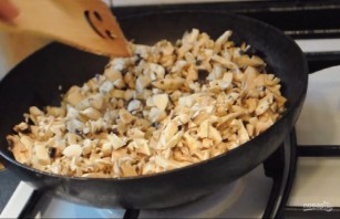 1. Нарежьте мелкими кубиками лук и шампиньоны. Обжарьте лук на растительном масле до золотистой корочки, добавьте шампиньоны. Обжаривайте все 15 минут до готовности.