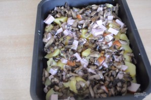 3. Отваренный в мундирах картофель нарежьте кружочками и выложите в форму для выпекания (смазывать ее не нужно). Вторым слоем выложите нарезанную мелкими кусочками ветчину. Далее — грибной слой.