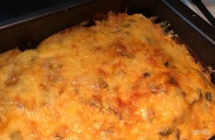 4. Равномерно распределите сверху с помощью лопатки ранее приготовленный соус и посыпьте запеканку натертым на крупной терке сыром. Выпекайте в разогретой до 180 градусов 30 минут.