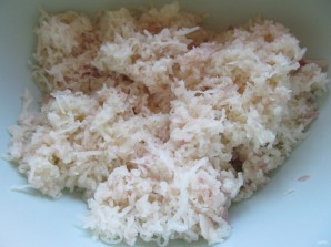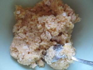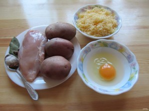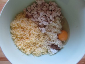 К картофелю добавьте мелко нарезанное куриное филе, сыр, яйцо, мускатный орех, соль и муку.