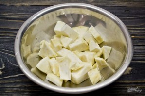 2. Очищаем от кожуры небольшой кусочек сельдерея, после чего нарезаем его небольшими кубиками и отвариваем до готовности. Обычно на полное его приготовление уходит около 5-8 минут.
