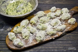 6. Добавляем муку и замешиваем все до однородного состояния. Катаем "колбаску" и нарезаем на небольшие части (как ленивые вареники). Теперь ставим кастрюлю с водой на плиту и доводим до кипения. Солим воду и бросаем в нее наши ньокки.
