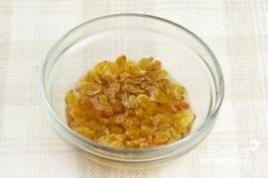 Изюм залить коньяком, добавить две столовых ложки воды и оставить. Пускай настаивается.