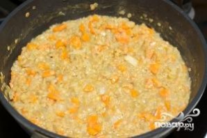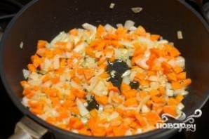 Разогреваем в сковороде растительное масло, обжариваем в нем лук и морковь до золотистости.