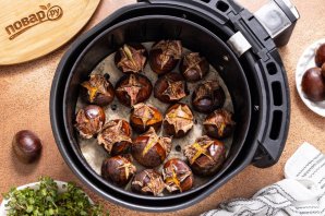 Аэрогриль заранее разогрейте в течение 10 минут на температуре 200 градусов. Затем разложите на решетке каштаны.