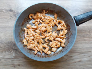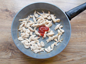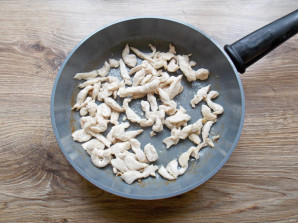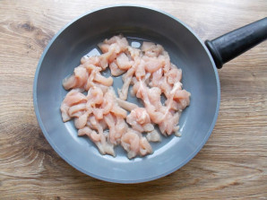Куриную грудку порежьте тонкой соломкой. В сковороду влейте растительное масло и разогрейте, добавьте курицу.
