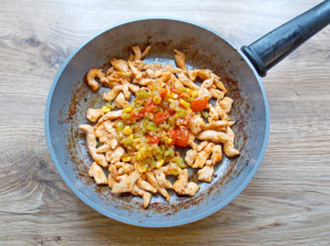 Добавьте обжаренные овощи и перемешайте. Прогрейте 1-2 минуты и снимите с огня.
