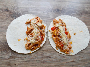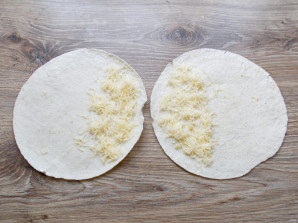Натрите сыр на мелкой терке и разделите его на четыре части. Разложите тортильи на стол и посыпьте одну половину лепешек сыром.