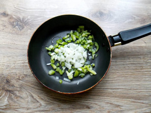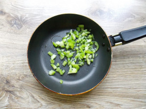 Болгарский перец порежьте кубиком. В сковороду налейте растительное масло и добавьте перец.