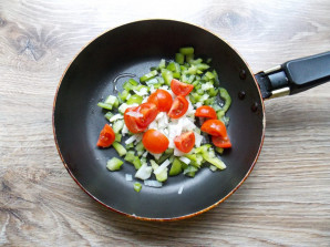 Черри разрежьте на 4 части и добавьте в сковороду с овощами.