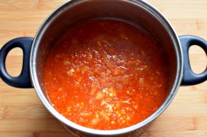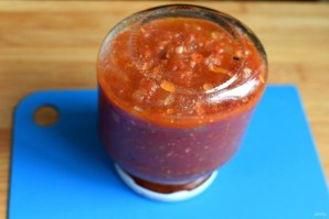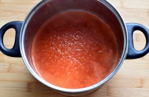 Пропустите овощи (кроме чеснока) через мясорубку или пробейте в кухонном комбайне. Я предпочитаю второй вариант – и быстрее, и консистенция нежнее. Перелейте овощную массу в кастрюлю и поставьте на средний нагрев. Уварите примерно на треть от первоначального объема.