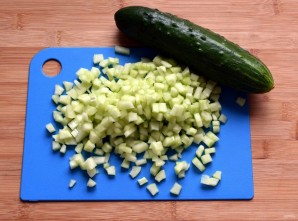 Огурцы очистите от кожицы и крупных семян, нарежьте мелкими кубиками.