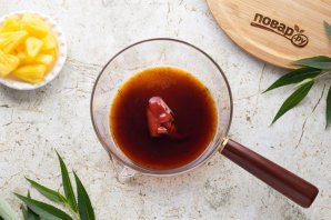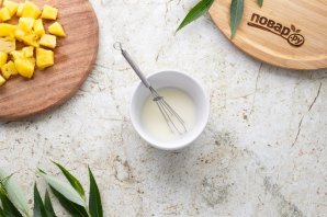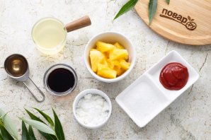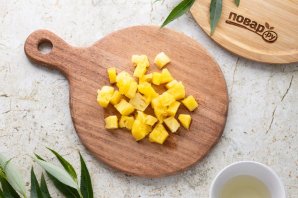 Слейте ананасовый сироп из банки, отмерьте необходимое количество для соуса. Ананасы откиньте на сито, порежьте их на кубики среднего размера, если используете ананасовые кольца или треугольники.