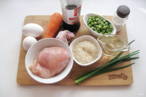 Подготовьте все ингредиенты для приготовления жареного риса с курицей.