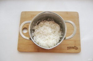 Отварите рис. Для этого его промойте и выложите в кастрюлю с горячей водой. Посолите по вкусу. Соотношение риса к воде 1:2.