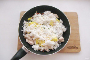 Вареный рис добавьте в сковороду к остальным ингредиентам.