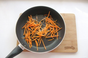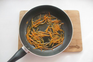 Морковь очистите, помойте и нарежьте тонкой соломкой. Выложите в сковороду.