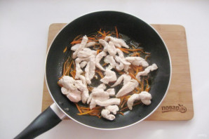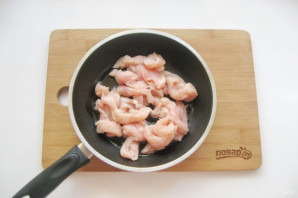 Куриное филе помойте, высушите и нарежьте полосками. Выложите в другую сковороду. Налейте масло и жарьте 5-6 минут перемешивая, почти до готовности.