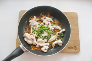 Выложите зеленый горошек. Налейте 50 мл. воды, накройте крышкой и тушите морковь с курицей и горошком 5-6 минут.