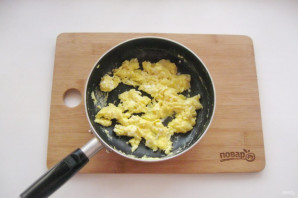 Взболтайте яйца и вылейте на сковороду с маслом. Постоянно перемешивайте, чтобы яйца поджарились кусочками.