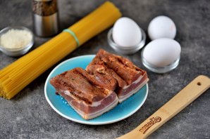 К этому времени сыровяленый бекон хорошо зарумянится, выловите его со сковороды шумовкой, жир для приготовления "Карбонары" не понадобится.