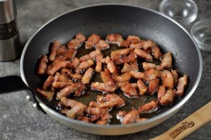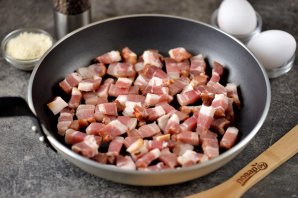 Срежьте с бекона всю шкуру, нарежьте его мелким кубиком, выложите в сковороду и жарьте на умеренном огне, пока не растопится весь жир.