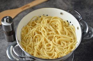Отварите пасту согласно инструкции, откиньте на дуршлаг. Отлейте немного воды, в которой варились макароны в большую чашку.
