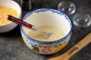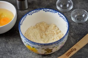 Переложите тертый пармезан в глубокую пиалу. В другую пиалу вбейте два мелких яйца и один желток, взбейте яйца до однородной массы с легкой пеной.