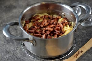 Верните спагетти в кастрюлю, в которой они варились, влейте соус, добавьте обжаренный бекон и тщательно все перемешайте. Во время перемешивания соус станет еще более кремовым.