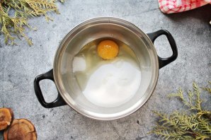 В кастрюлю с толстым дном разбейте яйцо, всыпьте сахар, ванильный сахар и щепотку соли. Все хорошо перемешайте.