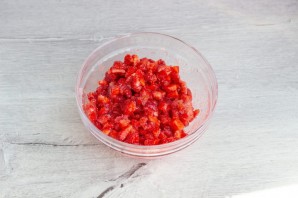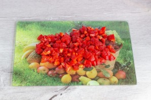 Теперь можно приготовить начинку. Заранее её делать не рекомендую, т. к. клубника очень быстро пускает сок. Нарежьте клубнику на кусочки.