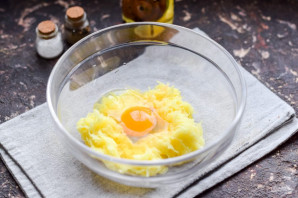 Картофель очистите, натрите на мелкой терке, немного отожмите жидкость. Добавьте к картофелю одно крупное куриное яйцо.