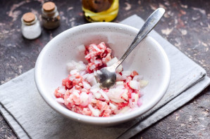 Лук очистите и нарежьте мелкими кубиками, добавьте лук к фаршу, смешайте, соль и перец добавьте по вкусу.