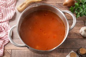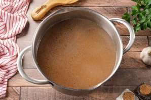 Переложите кости в кастрюлю и залейте водой. Морковь очистите и разрежьте на несколько частей. У лука снимите верхнюю шелуху и хорошо промойте. Добавьте в кастрюлю подготовленные овощи, перец горошком и петрушку. Петрушку лучше завязать в пучок, чтобы проще было потом вытащить её из бульона. Поставьте кастрюлю на плиту и доведите до кипения. Снимите пену и варите на самом минимальном огне около 2 часов.
