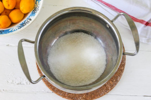 В кастрюлю или ковш всыпьте сахарный песок. Если абрикосы слишком сладкие, то добавьте щепотку лимонной кислоты.