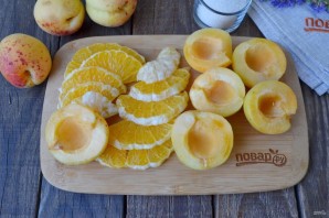 Вымойте абрикосы, удалите косточки. У апельсина снимите кожуру, удалите максимально белые пленки. Порежьте красивыми дольками.