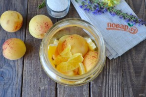 Итак, подготовьте продукты. На каждую литровую банку нужно рассчитать продукты: треть банки абрикосов, половинка апельсина, три столовые ложки сахара. Количество воды индивидуально, сколько войдет в банку. Количество абрикосов тоже может отличаться от моего, ведь размер фруктов разный, главное —наполнить баночку на треть.