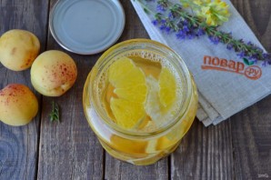 Сложите абрикосы и апельсины в банку. Залейте кипятком. Прикройте крышкой и дайте остыть, на это уйдет примерно часик.