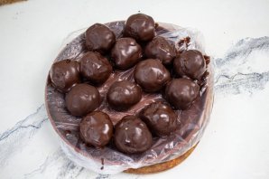 Дайте стечь лишнему шоколаду и переложите на блюдо, выстеленное пленкой. Уберите в холодильник на минут 30, до застывания шоколада.