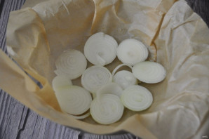 Сделайте луковую "подушку", для этого порежьте лук кольцами и выложите на дно формы.