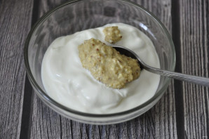 Добавьте в сметану чайную ложку горчицы, перемешайте.
