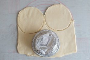 Приготовьте основу для корзиночек. Раскатайте слоёное тесто толщиной 0,3 см. Вырежьте круги по размеру формочки так, чтобы основание заходило на бортики.