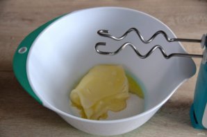 Взбейте сахар с размягченным сливочным маслом до пышности.